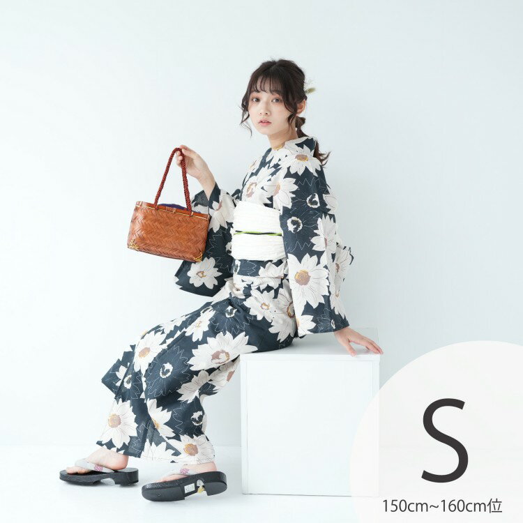 浴衣 レディース 3点セット(浴衣/帯/下駄) 紺 ネイビー 黄色 イエロー 白 ホワイト ひまわり 花柄