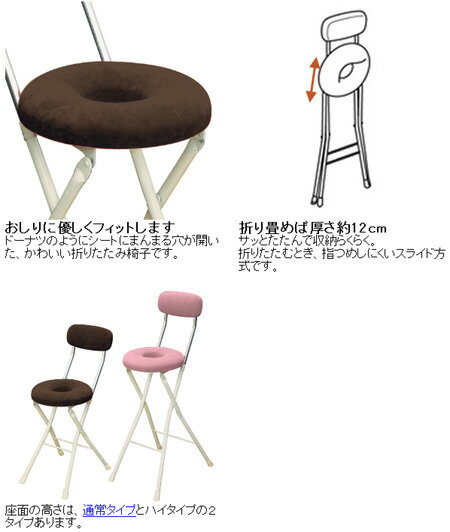ブラウン/ミルキーホワイトピンク/ミルキーホワイトおしりに優しくフィットしますドーナツのようにシートにまんまる穴が開いた、かわいい折りたたみ椅子です。