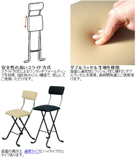 また、座面を内側にたたむ通常の折りたたみ椅子と比較して、スライド方式は指などの挟み込み事故も起こしにくくなっています。
